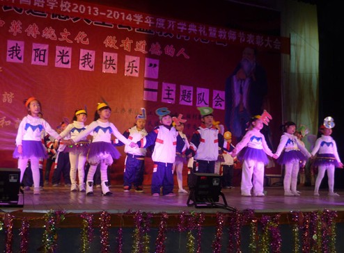 隊會在莊嚴的少先隊出旗曲中拉開序幕,少先隊隊歌《我們是共產(chǎn)主義接班人》響徹大廳。整個隊會采用互動形式,臺上臺下融匯一起,小學一至六年級的同學們在舞臺上用文藝形式表現(xiàn)出學校貫行“陽光教育”的主題,青年教師也著裝上臺朗讀,表達了爭做陽光教師的心聲,一曲《陽光總在風雨后》將教師團結(jié)合作,共建陽光和諧校園。