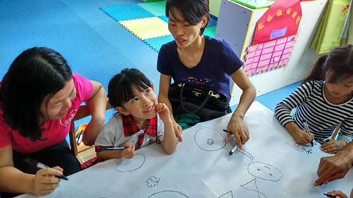 小朋友和老師家長們共同在畫紙上揮動手中的畫筆。看,小朋友們個個認真、專心畫畫的模樣,多可愛啊!