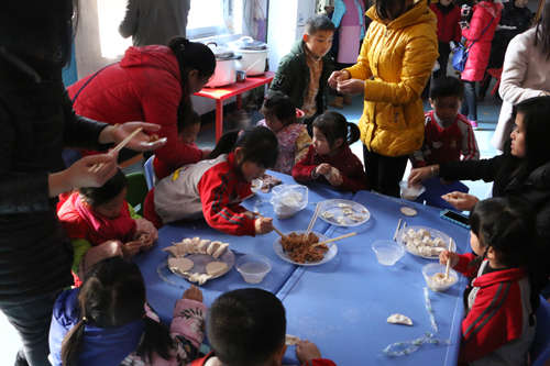 親子游戲結束后,家長和孩子們幸福地圍坐在一起調(diào)餡、包餃子。在各位家長的指導下,孩子們小心翼翼的學著包餃子:仔細的放餡,輕輕的捻餃子皮,可認真了!一個個富有創(chuàng)意的餃子在孩子們手中綻放。整個活動歡聲笑語,其樂融融,流淌著暖暖的親情,洋溢著濃濃的節(jié)日氣氛。看著自己完成的作品,吃著自己包的餃子,孩子們的臉上露出了得意興奮的表情。