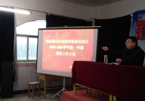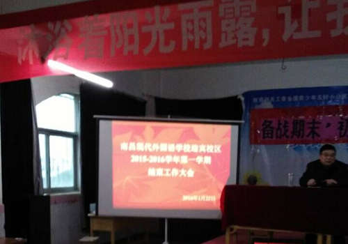瑞雪紛飛,預兆豐年,迎著瑞雪的腳步,南昌現代外國語學校迎賓校區全體教職工匯集在圖書館三樓會議室召開了2015-2016學年第一學期結束工作大會,與會的校領導有楊校長、初中部鄧校長、小學部傅校長和高中部肖主任,大會由鄧校長主持。