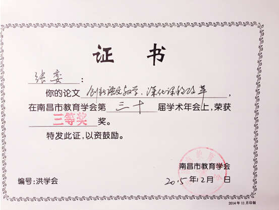南昌現代外國語學校(象湖校區)長期注重發揮教育理論的引領作用,通過搭建各類信息平臺,指導教師將教育理論與教育教學實踐緊密結合。廣大教師始終注重課堂教學效益,不斷提升教學實踐水平和教學研究水平,教學之余積極參與各種論文征集、交流、發表活動。近日,在南昌市教育學會第三十屆學術年會上,我校張小梅老師撰寫的論文《淺談低年級學生閱讀興趣的培養》和張孌老師撰寫的論文《創新語文教學,深化課程改革》,榮獲三等獎。希望獲獎教師再接再厲,繼續為推動學校教研工作而努力,同時也希望其他教師能積極撰寫論文,參與各級各類的論文評比活動,為全面推進學校發展作出貢獻。