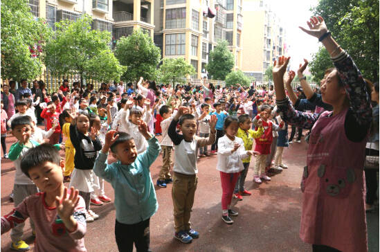 活動開始,在幼兒園老師的帶領下,孩子們隨著動感歡樂的音樂翩翩起舞,向家長們展示韻律操表演。小朋友們認真的跳著,不時變換著姿勢和花樣。家長們仔細觀看孩子們的表演,不時的給與熱烈的掌聲并拍照留念。