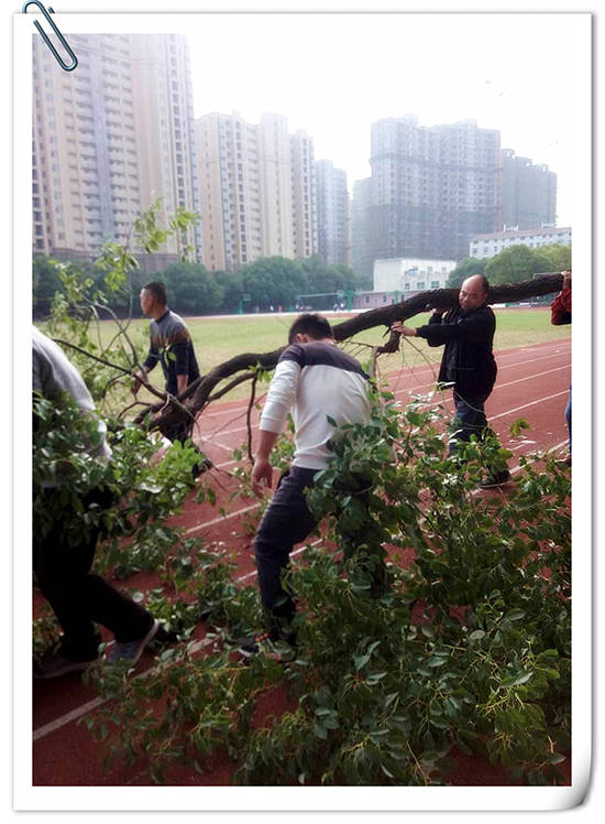 楊端煌校長接到匯報后,立即帶領學校總務江主任、政教張主任、保衛熊科長、校醫、保安等人趕到現場。做完初步的分工后,不怕臟不怕累,親自動手據樹、抬樹。經過一個下午熱火朝天的修剪與清理,徹底消除了安全隱患,給師生們一個安全整齊的校園環境。同時,運動場也變得更加寬敞明亮了。