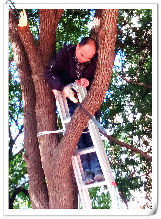張主任站在梯子上鋸樹