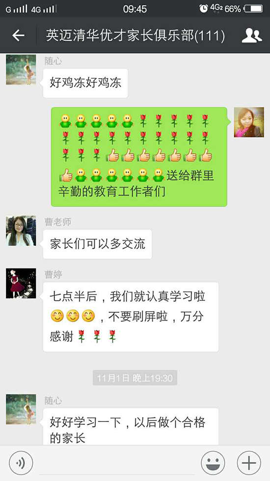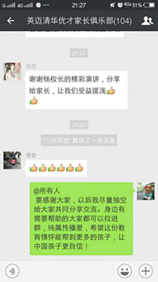 楊校長(zhǎng)積極和微信群中的家長(zhǎng)溝通交流