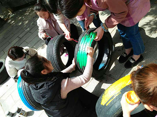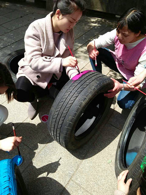 輪胎作為一種低結(jié)構(gòu)廢舊材料,有無限的利用和創(chuàng)意空間,既能美化幼兒園環(huán)境,又能促進(jìn)幼兒的體、智、能發(fā)展。為了給孩子們提供更加豐富多彩的游戲材料,迪斯尼·金沙園積極收集大量不同型號(hào)的廢舊輪胎,2017年3月28日上午,楊園長(zhǎng)帶頭組織教師們利用課余時(shí)間,大膽進(jìn)行創(chuàng)意彩繪活動(dòng),對(duì)輪胎進(jìn)行美化。