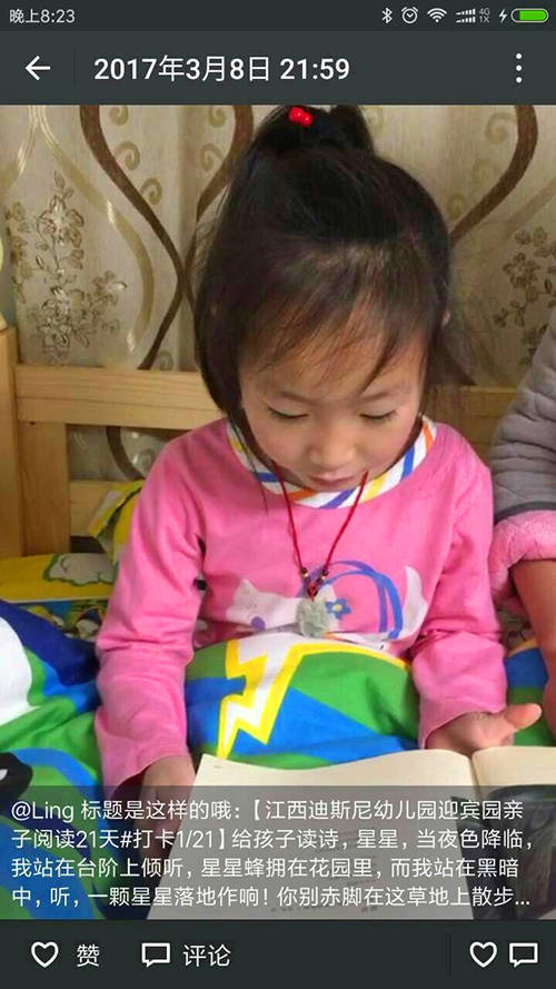 考慮到不同年齡段孩子的不同發展需求,幼兒園還細致周到的分別為小、中、大班的孩子選定了不同的打卡主題。大班為親子閱讀,中班為我是家庭好幫手,小班為好習慣培養。