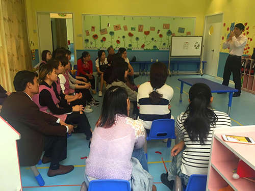 活動中,黃老師用PPT向在座的每個人展示并講解了救護新概念及心肺復蘇術的步驟、手法等相關知識,幫助老師及家長們掌握了正確的急救方法。同時,通過現場模擬示范,詳細的進行了心肺復蘇的動作演練,教師、家長們紛紛參與其中,進行模擬操作。
