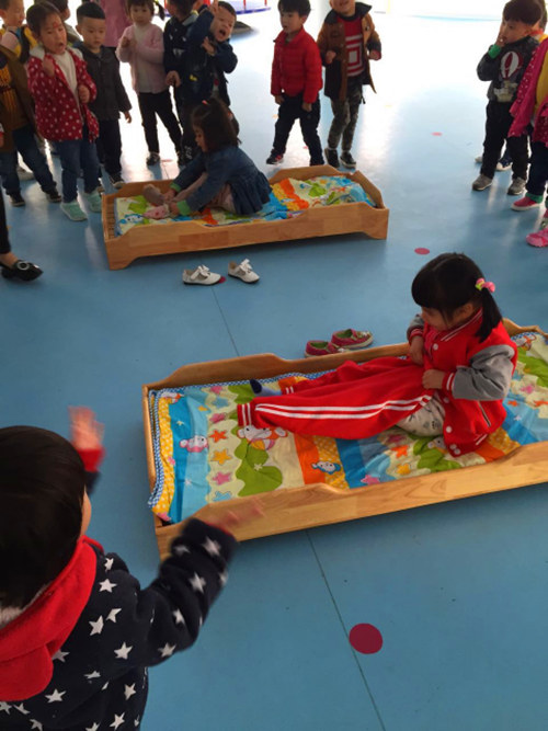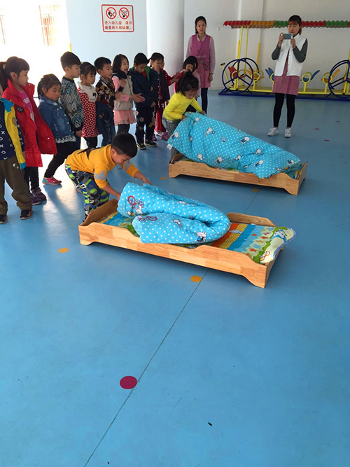 3、大班“疊被子”,幼兒將誰亂的被子折疊擺放整齊。