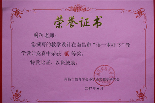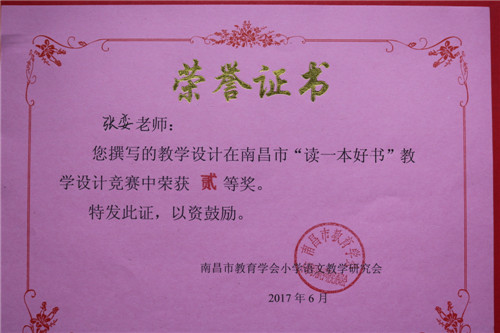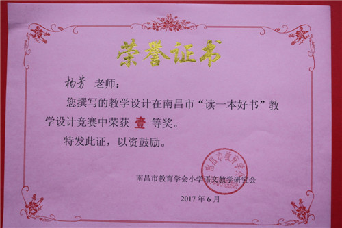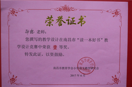 南昌外國語學校(象湖校區)積極組織教師參加活動。教師非常重視,專心讀書,精心備課,用心設計。通過層層評選,學校教師楊芳撰寫的《讀一本好書》--《魯濱孫漂流記》教學設計,邵露老師撰寫的《隙中窺月,感悟真情》--《夏洛的網》教學設計,榮獲南昌市“讀一本好書”教學設計競賽壹等獎的好成績,殷巧、周麗、董茜、張孌四位老師分別榮獲貳等獎。