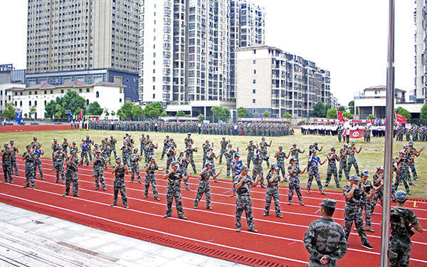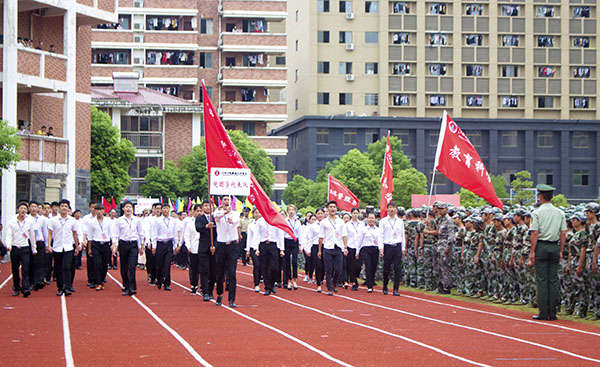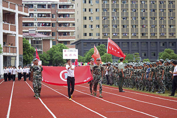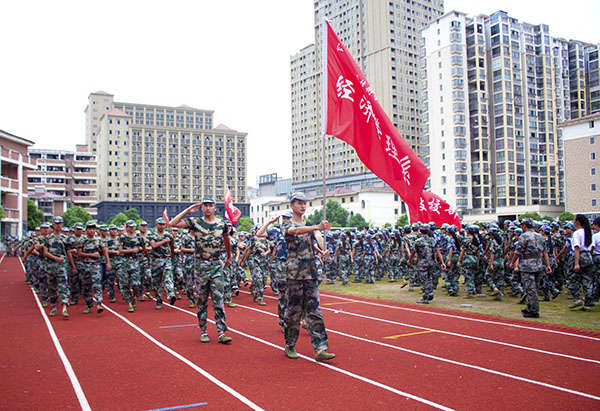 伴隨著莊嚴的國歌聲,五星紅旗冉冉升起,在操場上空迎風飄揚。隨后是全校軍訓新生分批進行隊列匯報表演,統一的迷彩裝,整齊的步伐,體現了工商新生在新學期飽滿的熱情和積極的態度。院長劉明初走到學生方隊中進行檢閱。一句句嘹亮的口號聲響徹云霄,一組組方陣從主席臺前經過,同學們個個精神飽滿,軍姿挺拔,在教官的帶領下邁著整齊的步伐昂向前,出色的表現不時贏得現場領導和老師的陣陣掌聲。