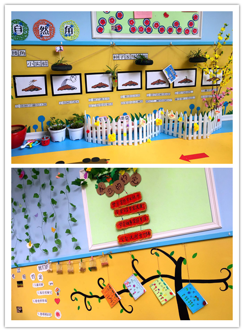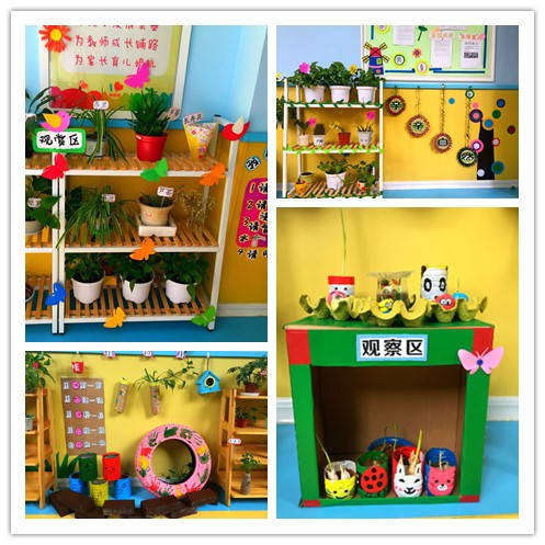 各班秉承著季節性、豐富性、童趣性、探索性、參與性的理念,創設了具有本班特色的自然角。各自然角都有自己的主題,如觀賞區、種植區、實驗區讓幼兒通過對植物連續性的觀察,了解植物的生長過程。教師們巧思妙想,利用蛋托、奶粉罐、泡沫盒、舊抽屜等各種材料加工制作成形態各異的花盆,種植不同的植物;同時讓幼兒參與對自然角的種植和管理,記觀察記錄,給植物澆水等,培養幼兒細致的觀察力,形成管理好自然角的責任感。