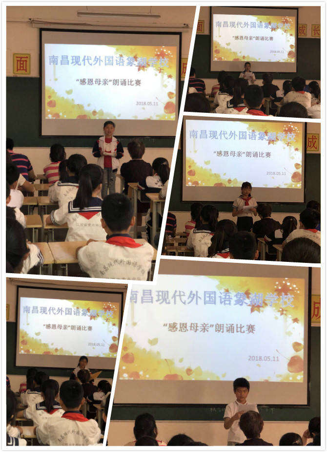 五月十一日下午二時(shí)許,南昌現(xiàn)代外國(guó)語(yǔ)象湖學(xué)校小學(xué)部六年級(jí),在教學(xué)樓五樓多媒體教室舉行了以“感恩母親”為主題的朗誦比賽。