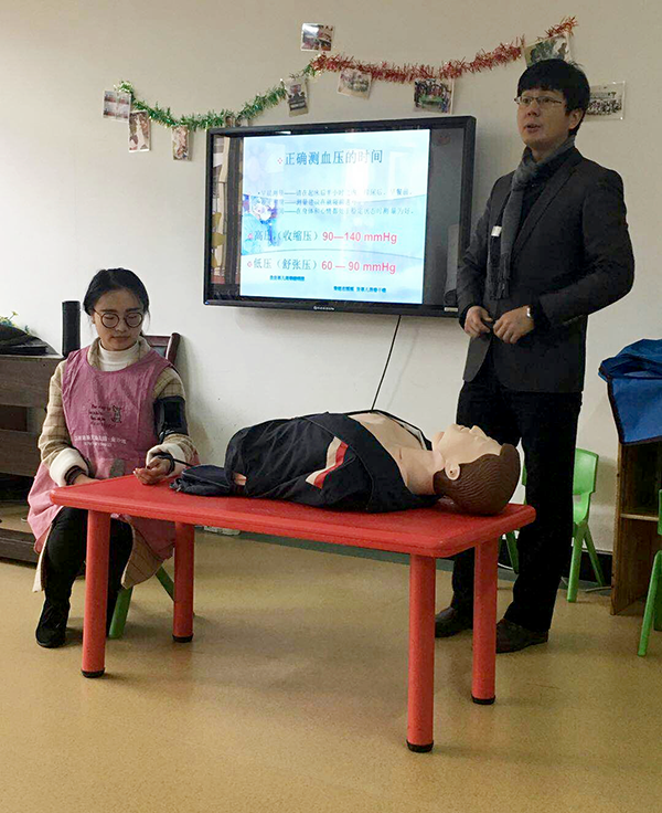 ?本次講座內容以幼兒園突發事件的應急與處理為主,圍繞“突發事故公共衛生安全事件的應急處理”的主題展開。講座中王老師以幾個典型的例子,向大家講述了緊急救護知識培訓的重要性;其次,王老師重點對現場心肺復蘇術和止血的方法進行了詳細的講解和現場模擬演示,幫助老師們直觀地掌握這些常見的緊急救護技巧,王老師還對我們講解了指壓血法、靜脈出血,緊接著,王老師還對什么時間段最好測血壓進行了介紹,同時邀請了教職工們上前嘗試測血壓。宣傳健康第一、預防為主的健康理念,老師們深受觸動。
