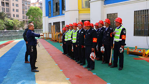 為保證演習順利進行,聚龍物業提前熟悉勘察場地,并制定出詳細健全的演習方案。演習當天下午14:00,聚龍物業的保安在保安室換上安全頭盔、消防服、防毒面罩等,并拿好消防器材后,全員到樓下操場進行清點集合。隨即前往金沙園、象湖園、芳草園開展消防聯合演習。
