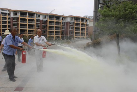 據(jù)了解,此次培訓主要圍繞物業(yè)人員消防職責、火災發(fā)生時人員組織疏散逃生措施、消防設備日常檢查及滅火器的使用介紹等方面展開。演練開始前,保安人員在物業(yè)公司保安隊長的帶領下進行隊列訓練。隨后,參演保安人員依次使用滅火器和消防栓進行滅火消防演習。